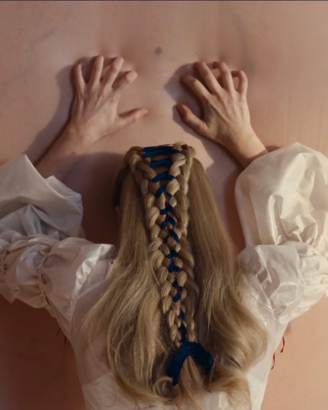Indimenticabile la scena in cui Catherine tocca il muro come se fosse vivo e ci si volesse aggrappare o con le mani volesse graffiarlo: le mani aperte, la fronte vicina, il corpo teso appena: non è un gesto, è una domanda. Il muro ha quasi lo stesso colore della sua pelle, e per un attimo pare che lei voglia entrarci dentro, sparire lì, dove nessuno vede e nessuno chiede. È composta, con quella treccia perfetta che sa di disciplina, ma sotto si intuisce il contrario: qualcosa che spinge, scalpita, preme contro la pelle.
